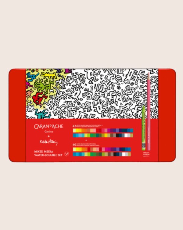 Das vielseitig anwendbare Stifte-Set „Keith Haring“ ist das ideale Geschenk für Fans, die gerne bunt mögen und verschiedene Aquarelltechniken ausprobieren möchten. Das Multitechnik-Set bestehend aus 42 Aquarell-Pastellen und 40 wasservermalbaren Buntstiften ist das Ergebnis der Zusammenarbeit einer engagierten Künstlerikone und einer kreativen Manufaktur mit dem gemeinsamen Wert: „Kunst für alle, überall, in jedem Alter“.
