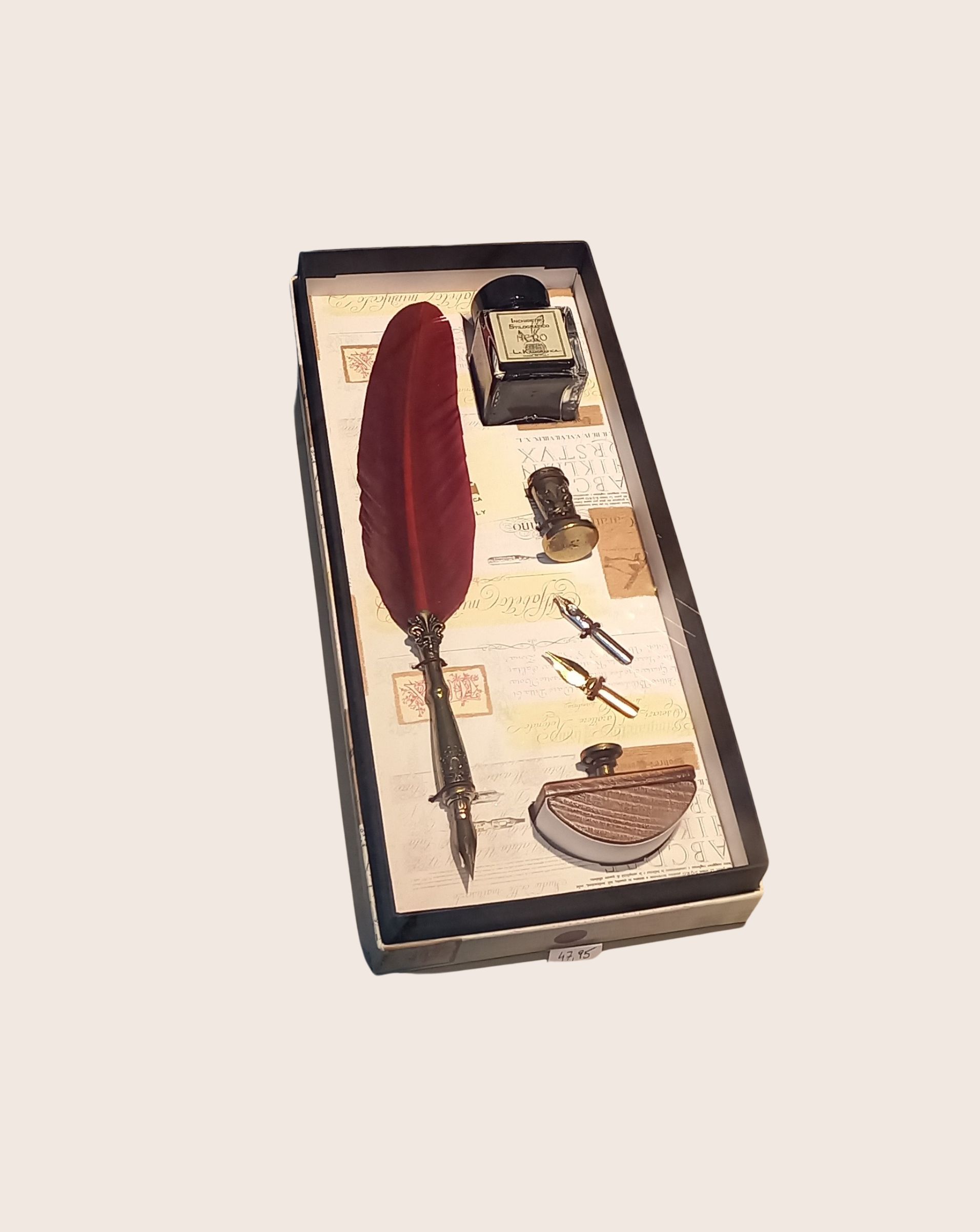 Kalligrafieset zum Beispiel mit Federhalter aus Metall, 2 Wechselfedern, Köcher, Tinte und Löschwiege.
