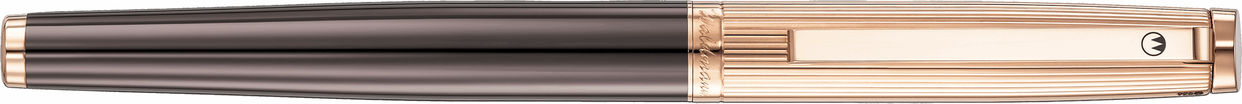 Der Tintenroller besteht aus einem dunkelbraunem Schaft und einem Griffstück aus 24kt. Roségold plattiert.